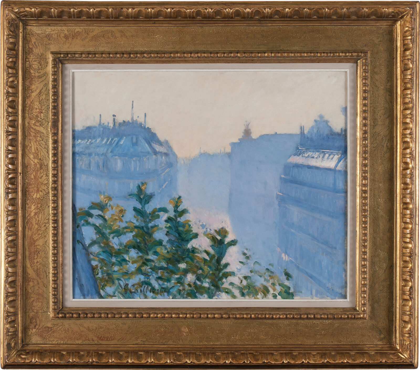In drei Gemälden nahm Gustave Caillebotte die imposanten Wohnhäuser rund um die Pariser Oper in den Blick. Aus dieser Perspektive verstellen die Balkonpflanzen den freien Ausblick und nötigen den Betrachter, seinen Blick zu schärfen. Das kalte, dunstige Morgenlicht verbindet sich mit dem Silbergrau der Zinkdächer zu einer Symphonie in Blauviolett.