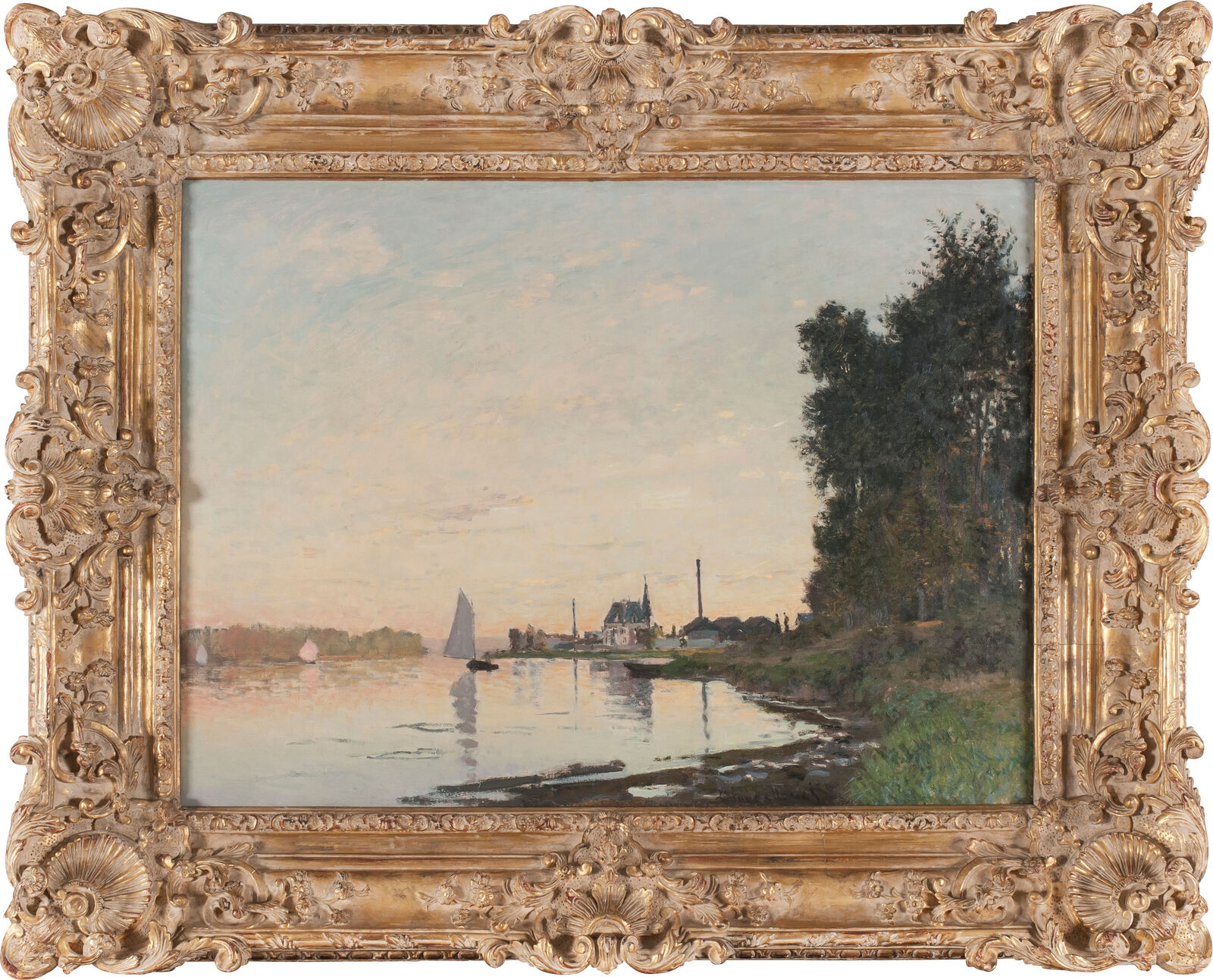 Zwischen 1871 und 1878 lebte Claude Monet in Argenteuil – einem idyllischen Vorort an der Seine, der zusehends von der Industrialisierung im Umkreis der Hauptstadt erfasst wurde. Schneisenartig lenkt die Uferpromenade den Blick in die Ferne, wo eine traditionelle Villa im Stil des 17. Jahrhunderts von hoch aufragenden Fabrikschornsteinen flankiert wird. Im Licht des späten Nachmittags leuchten Himmel und Fluss in Nuancen von zartem Rosa und Gelb.