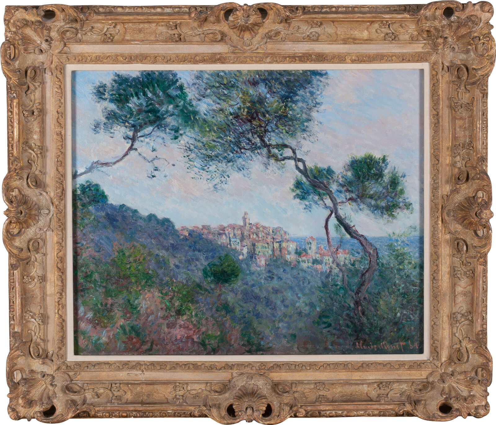 In Briefen an seine Lebensgefährtin Alice dokumentierte Monet seine Fortschritte bei der Arbeit und versicherte, dass er zwischen seinen Freilichtstudien jede freie Minute mit der Suche nach Motiven in und um Bordighera verbringe. Da Monet die Landschaften topographisch stets mit großer Präzision erfasste, war die Suche nach Perspektiven und Blickachsen, die sich für die Umsetzung in ein formal reizvolles Bild eigneten, ein zentraler Aspekt seiner Arbeit. Diese Komposition malte er von der Anhöhe der im Westen Bordigheras gelegenen Collina dei Mostaccini aus, von der sich der Blick auf die Altstadt und das dahinterliegende Meer öffnete. Die Silhouette der Steinbauten mit ihren rot leuchtenden Ziegeldächern umrahmen die gewundenen Stämme zweier Pinienbäume, die in kräftigen Grüntönen und unvermischtem Schwarz gestaltet sind. Im gleißenden Licht des Südens ist die Vegetation im Mittelgrund in einen violettfarbenen Dunstschleier gehüllt, während der Himmel in hellen Rosatönen gehalten ist.