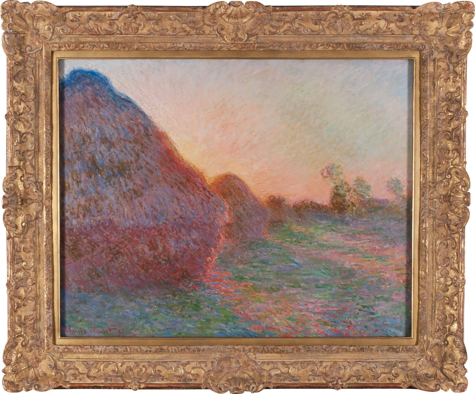 In einer umfangreichen Serie von 25 Gemälden widmete sich Claude Monet 1890/91 den Getreideschobern, die in der Nähe seines Hauses in Giverny auf den Feldern standen. Systematisch nahm er sie bei unterschiedlichen Licht- und Witterungsverhältnissen in den Blick. Hier führt Monet den Blick diagonal entlang einer Reihe von Schobern in die Bildtiefe. Die Sonnenstrahlen kreuzen diese Diagonale. Die leuchtende Farbigkeit kulminiert an den Rändern des vorderen Schobers.