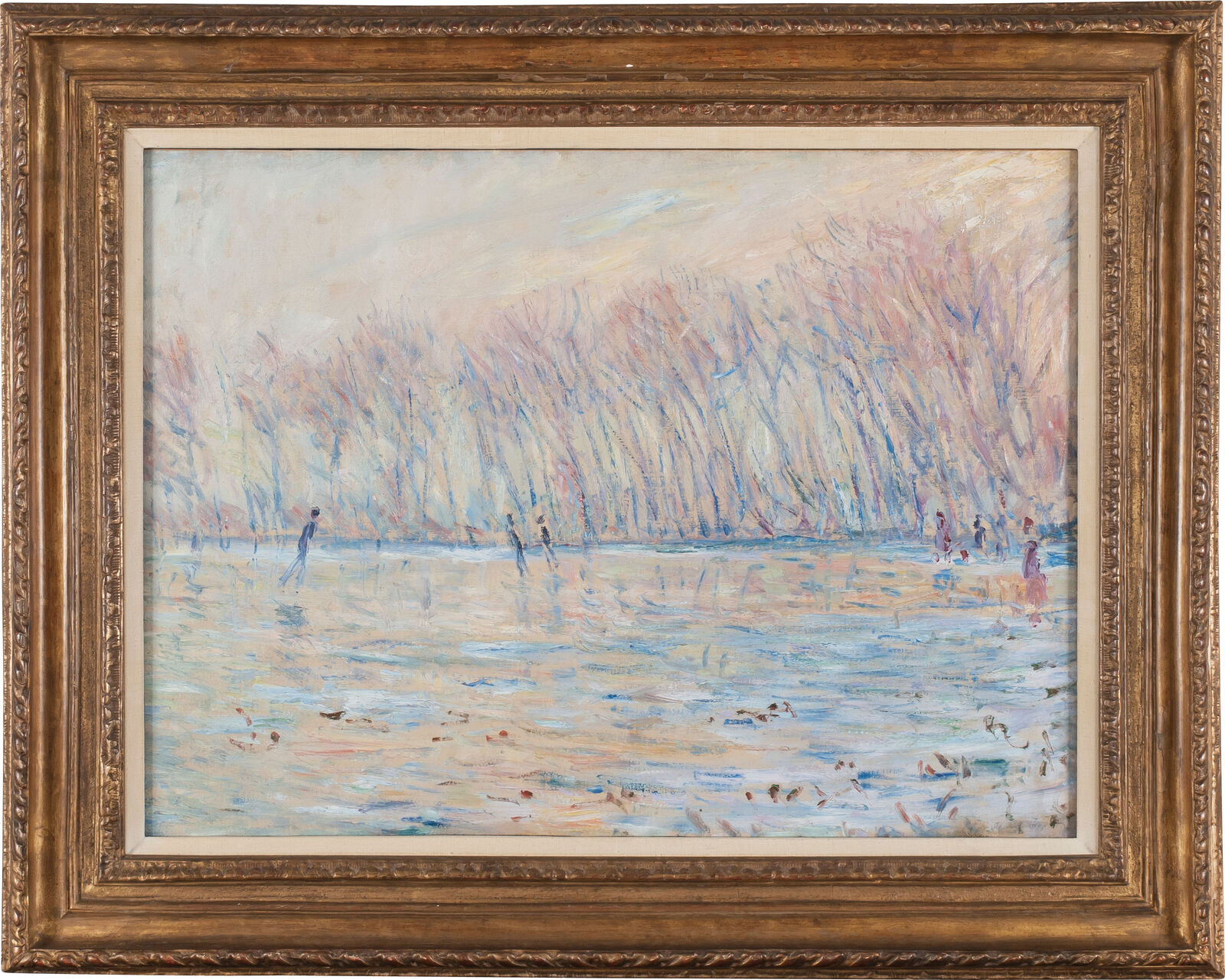 Das warme Orangegelb der untergehenden Sonne, durchsetzt mit rosa und blauen Akzenten, ist der bestimmende Farbton, mit dem Claude Monet die Komposition in fast abstrakter Manier gegliedert hat. Die Bewegung der Schlittschuhläufer und die Neigung der Pappeln geben dem Bild eine Dynamik, die der starren Kälte entgegensteht.