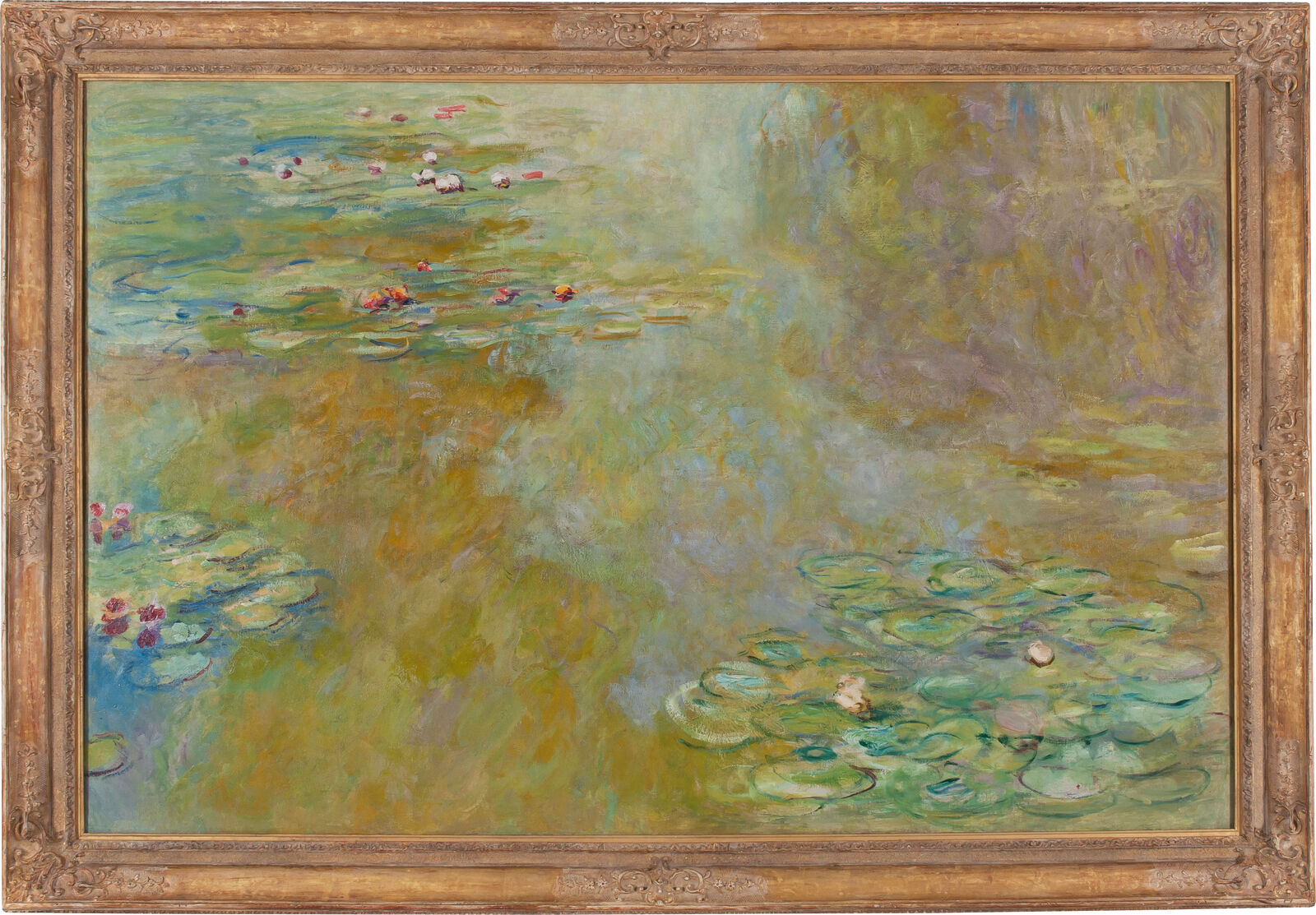 In seinen frühen Darstellungen der Seerosen von 1903/04 hatte Monet räumliche Tiefe angedeutet, die das Ufer oder die den Teich umgebende Vegetation in den Bildraum einbezog. Doch bereits in diesen Kompositionen emanzipierte sich die reflektierende Oberfläche des Wassers als dominantes Bildmotiv, durch das den festen Konturen der Seerosen die stets changierenden Spiegelungen von Vegetation und Himmel gegenübergestellt werden können. In späteren Variationen wie dieser großformatigen Darstellung, in der er auf jegliche Motive außerhalb des Teichs verzichtete, tritt Monets Interesse an den geheimnisvollen Farbverläufen innerhalb der Reflexionen stärker in den Vordergrund. Das Wasser fungiert als reine Projektionsfläche und damit metaphorisch als eine Doppelung der realen Leinwand. Der Prozess der Fragmentierung sowie die ausgeprägte Nah- und Aufsicht wirken den konventionellen Regeln der Landschaftsmalerei entgegen: Oben und unten, Vorder-, Mittel- und Hintergrund bieten dem Betrachter keine verlässlichen Orientierungspunkte mehr. Stattdessen erscheint der Teich in einem Allover-Effekt als einheitliche, räumlich entgrenzte Bildfläche, die einen freien Umgang mit Farbe und Form als autonomen Gestaltungsmitteln erlaubt.