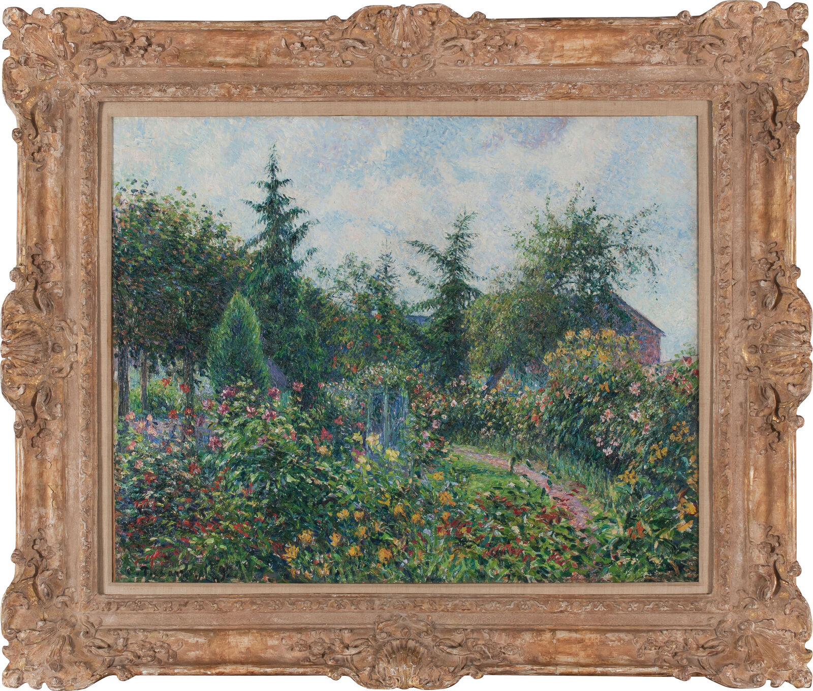 Während seines Aufenthalts bei Mirbeau arbeitete Pissarro an vier großformatigen Ansichten seines Hausgartens – eine Leidenschaft, die dieser mit Monet teilte, mit dem er sich über Fragen moderner Hortikultur austauschte. In Pissarros Darstellung erscheint die Blütenpracht des Gartens im hellen Licht eines herbstlichen Nachmittags. Kräftige Akzente in Rot, Pink, Rosa, Gelb und Orange stechen aus der von Grün dominierten Komposition hervor. Motive, die auf menschliche Nähe hindeuten – Pflanzengitter und Hühnerstall –, treten hinter dem üppigen Wachstum zurück, in das der schmale, rosafarbene Pfad rechts dem Betrachter bildlich wie metaphorisch Zugang gewährt.