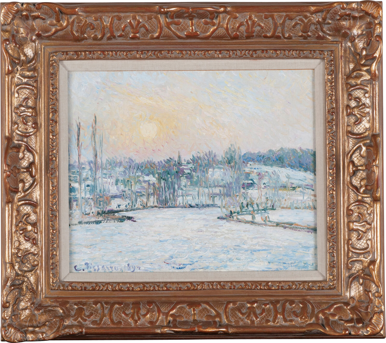 Immer wieder, zu allen Tages- und Jahreszeiten, hielt Camille Pissarro diesen Blick fest. Hier sind Himmel und Schneefläche in ähnlich pastosem Pinselduktus gestaltet, allerdings in der Farbtemperatur unterschieden. Nicht nur die von der Sonne angestrahlten Wolken, sondern auch die violetten Bäume vermitteln einen warmen Farbeindruck.