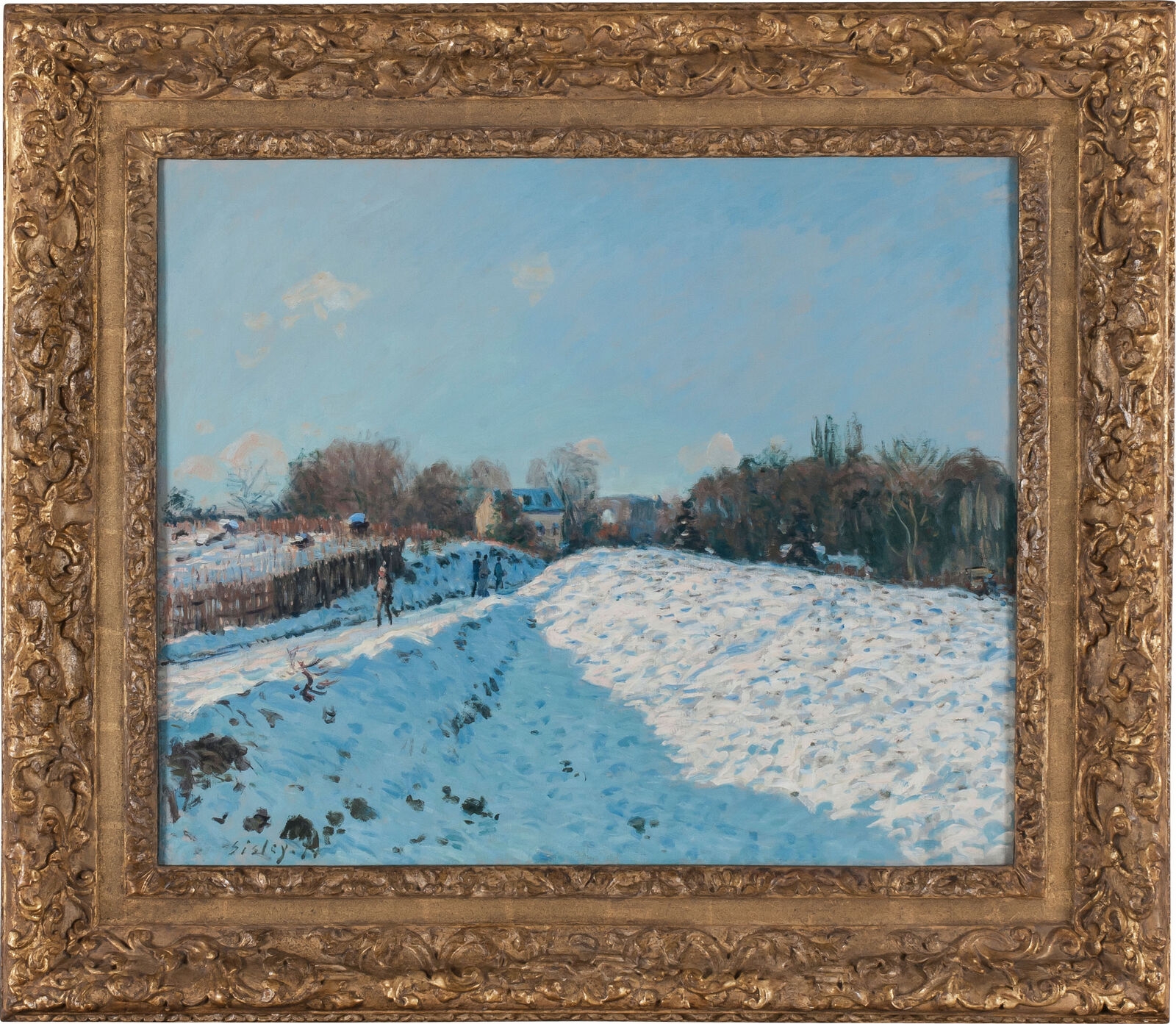 Dieses Winterbild entstand 1874 – dem Jahr, in dem Alfred Sisley mit seiner Teilnahme an der ersten Impressionisten-Ausstellung in Paris auf sich aufmerksam machte. Der starke Schlagschatten im Vordergrund lenkt den Blick des Betrachters zur Gruppe der Spaziergänger. Sie verleiht dem Gemälde etwas Momenthaftes.