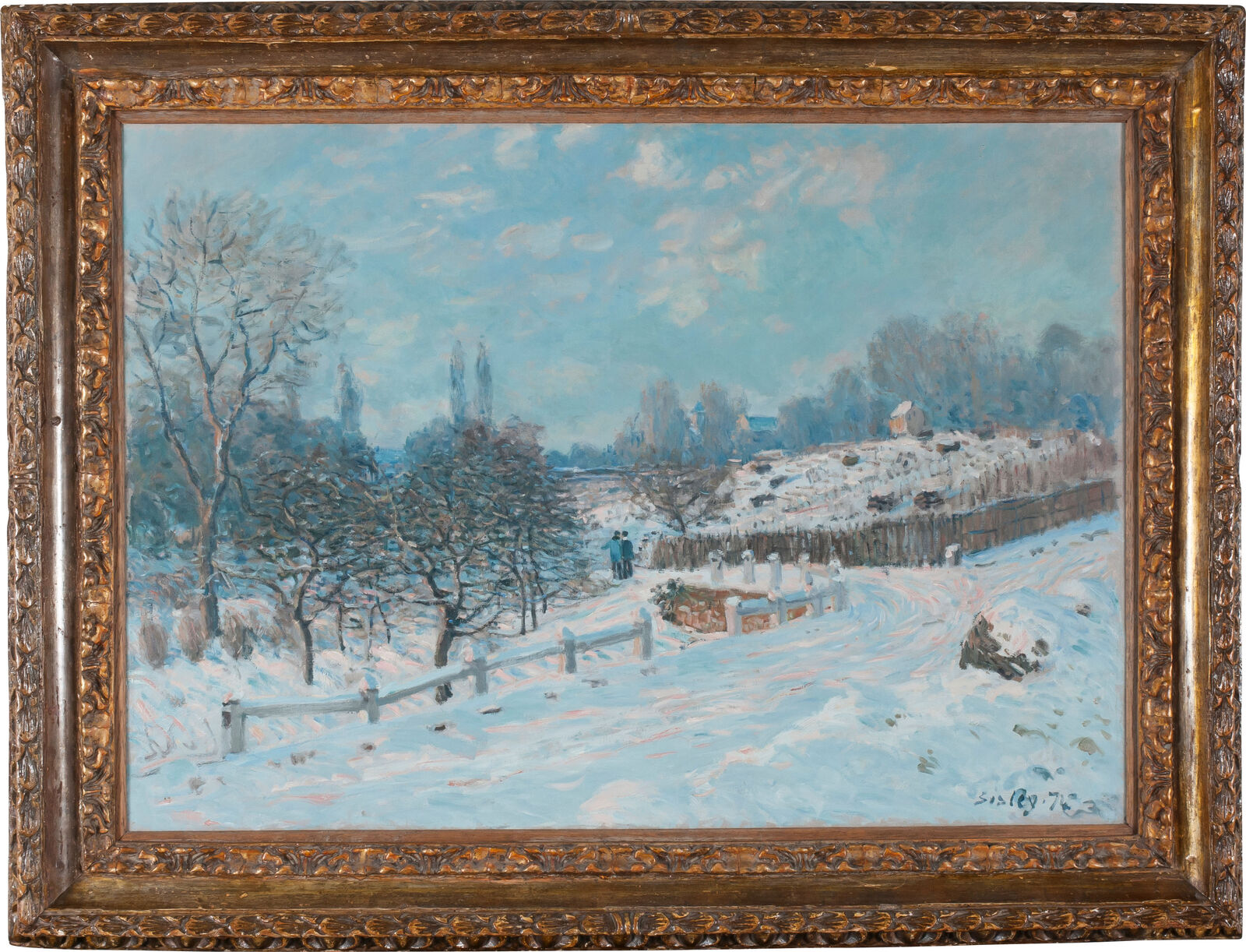 Von Pierre-Auguste Renoir ist der Ausspruch überliefert, gemalter Schnee solle alle Farben der Umgebung widerspiegeln und daher nie in reinem Weiß wiedergegeben werden. Hier hat Alfred Sisley die Formen der schneebedeckten Landschaft mit warmen Schattierungen von Hellblau und Rosa herausgearbeitet.