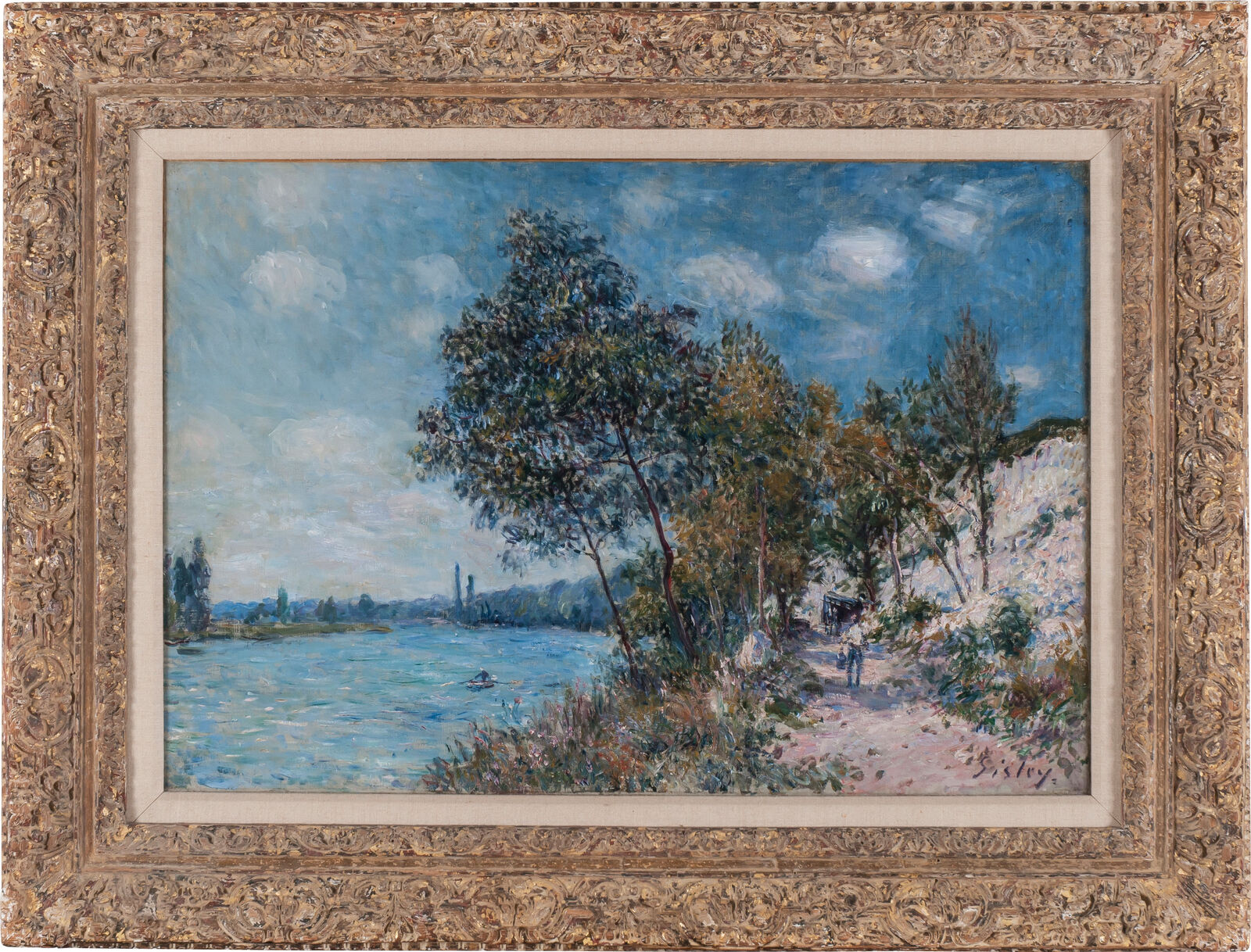 Hell schimmert der Kalkstein am Ufer der Seine. Alfred Sisley wählte viele Schattierungen für das weiße Material. Den aufgebrochenen Hang gab er in pastosem Farbauftrag wieder. Die leichte Bewegung des Wassers nuancierte er mit horizontalen Pinselstrichen in Grün, Blau und Weiß. Das Nachbardorf seines Wohnorts Moret hielt der Künstler in über 60 Gemälden fest.