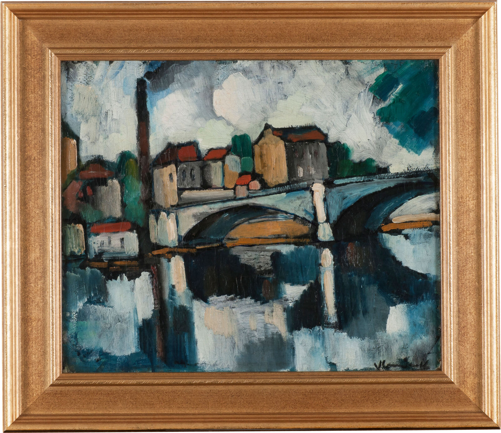 Hier sind Maurice de Vlamincks fauvistische Strichbündel zu Flächen geworden. Die Konturen von Brücke und Häusern lösen sich in der Spiegelung auf der Wasserfläche auf. Die zurückgenommenen Farbtöne, das Umschlagen der Primärfarben in Grau zeugt von seiner Auseinandersetzung mit den Grau- und Ockertönungen im Kubismus Picassos, den er 1906 kennengelernt hatte.