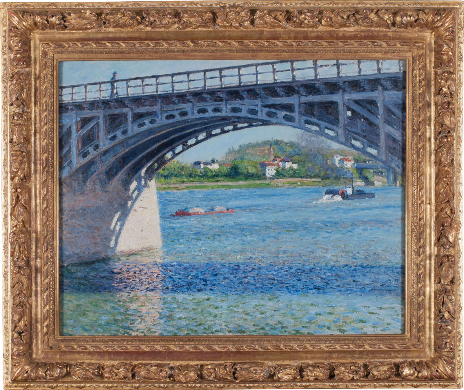 In 1881 Gustave Caillebotte moved to Le Petit-Gennevilliers, a small village on the Seine River adjacent to the Parisian suburb of Argenteuil where Claude Monet had lived from 1871 to 1878. A resort location famous for its boat rides and sailing regattas, the area offered appealing motifs for the enthusiastic water sportsman. In many of his works, Caillebotte chose views that had already been painted before him by Monet and other Impressionists. One such motif was an imposing pedestrian bridge, originally designed in 1830–31 and repaired at great expense following its destruction in the Franco-Prussian War of 1870–71.