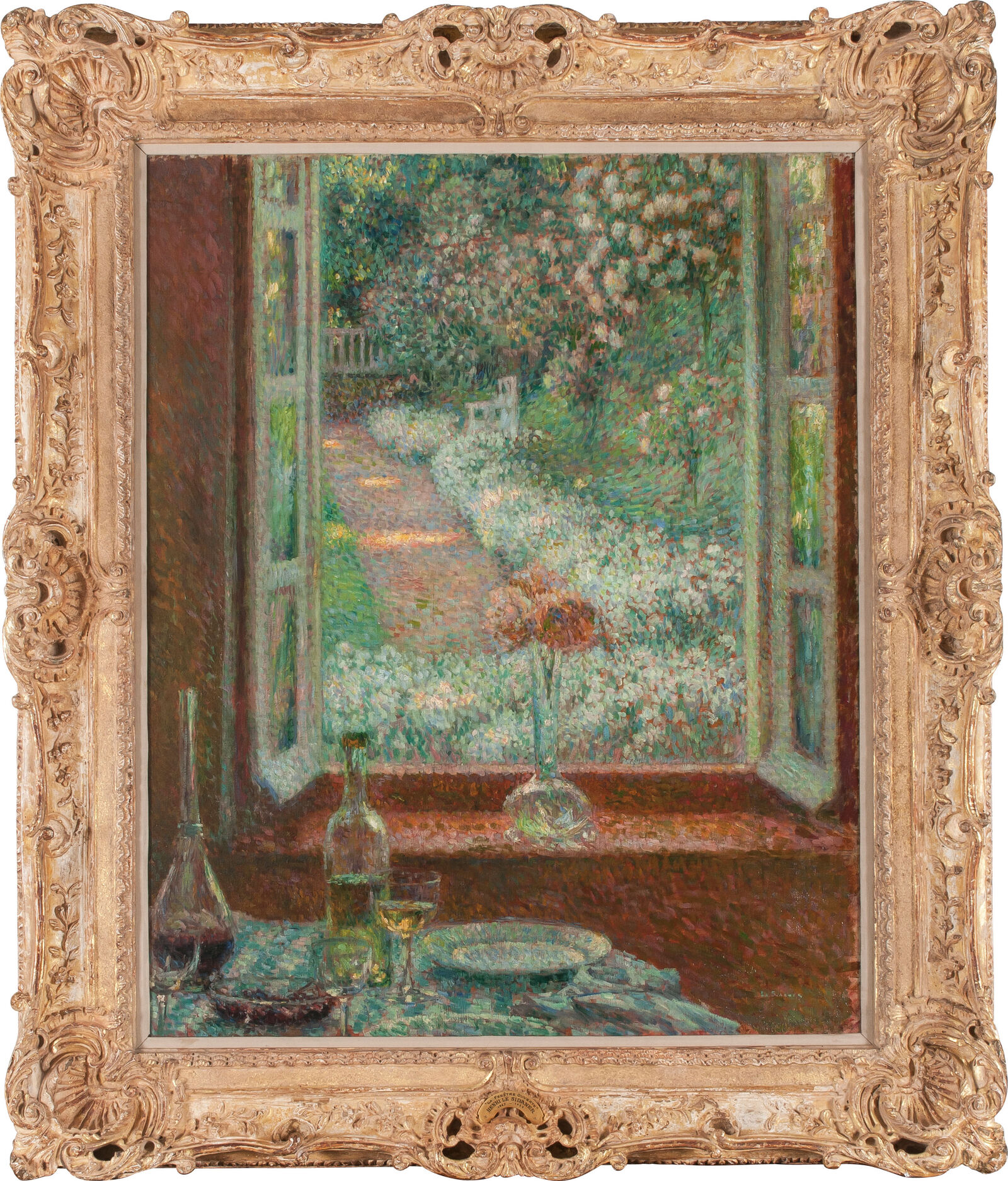Window with Carnations, Gerberoy was painted in 1908 and shows the view from Le Sidaner’s dining room into the inner courtyard of the manor, where he had planted an elaborate flower garden. Despite the diffuse-seeming composition with the shimmering colors typical of Pointillism, the textures of the objects arranged on the table in the foreground are precisely rendered—as are the glistening flower vase in the center and the casements of the open window, whose glass reflects the green-yellow tones of the vegetation. The pull into perspective depth, achieved by the prominent placement of the window, is intensified still more by the diagonal line of the garden path. As with many of Le Sidaner’s compositions showing a view to the outdoors, here too the traditional conception of painting as a “window to the world” has symbolic resonance. At the same time, the motif blurs the boundary between the genres of interior and landscape, a direction that artists like Henri Matisse and Pierre Bonnard also explored in the early twentieth century.