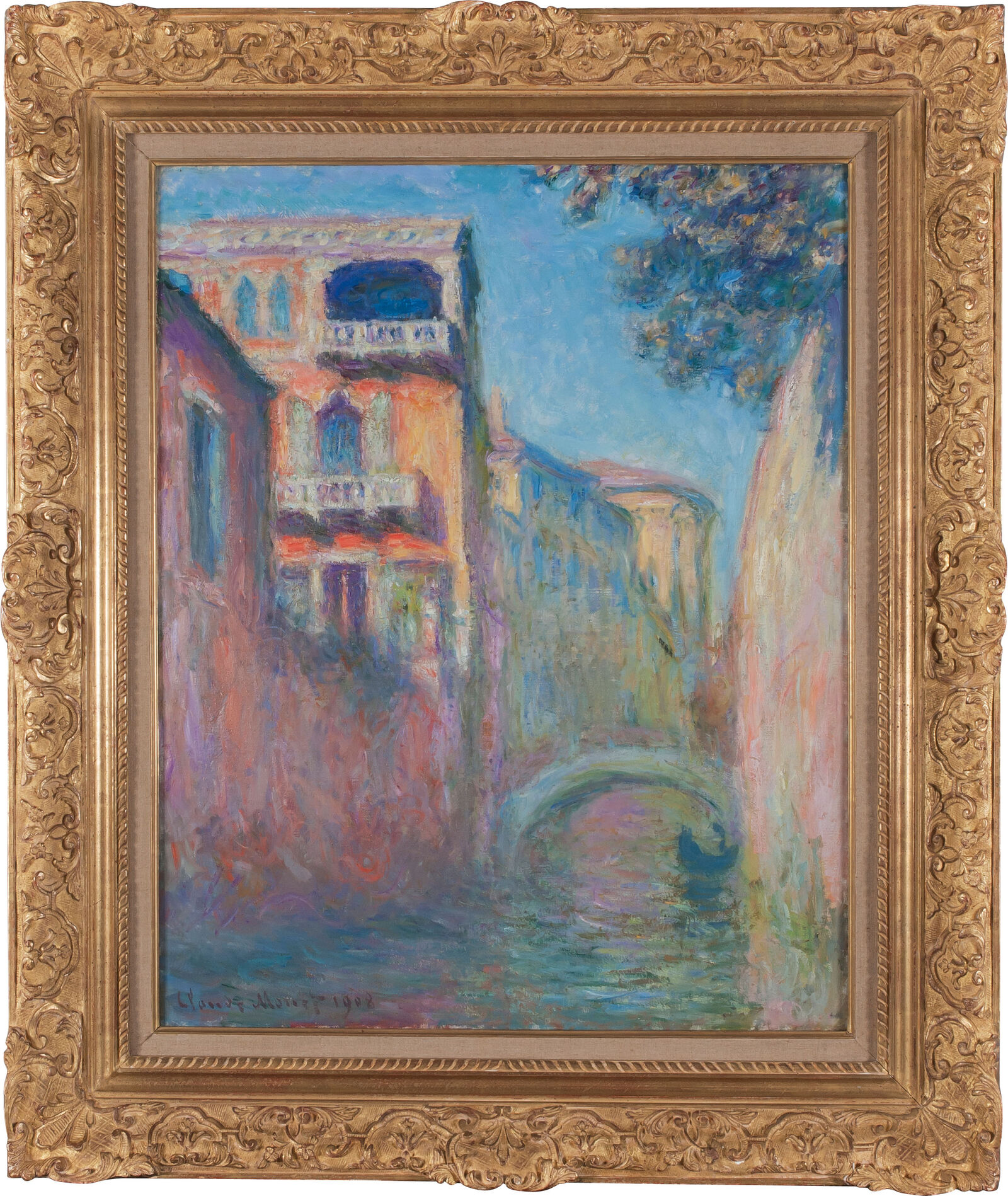 In his Venetian works, Monet chose a limited number of motifs which he observed repeatedly, always at the same time of day and from the same vantage point. While many of his paintings depict prominent buildings such as the Palazzo Contarini or the Palazzo Ducale, the composition shown here belongs to a group of three works in which he focused on a less famous motif: the canal Rio della Salute, named after the nearby Baroque church of Santa Maria della Salute.