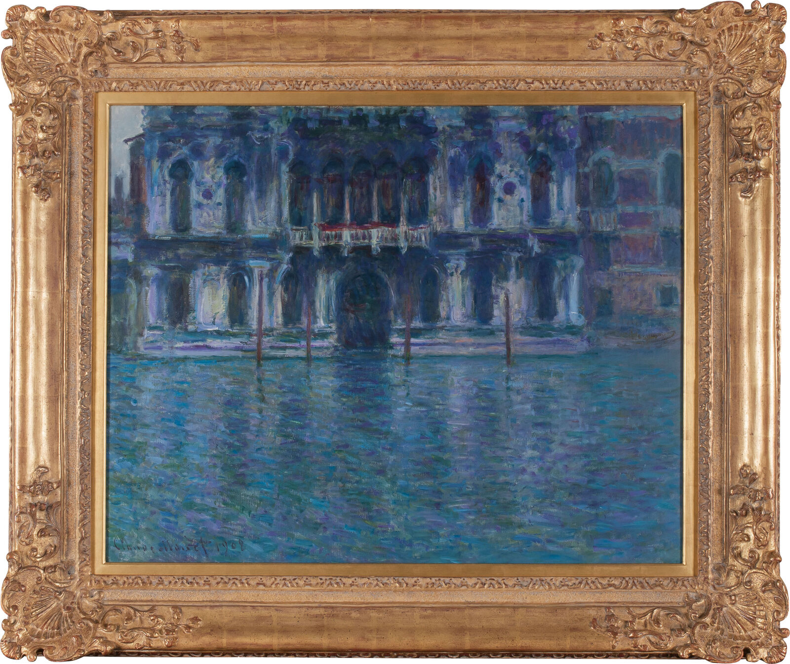 Throughout his series of paintings of Venetian palaces, Monet seems to have been attracted to the interplay between the colored reflections on polychrome stone facades and the surface of the water. A similar interest in subtle variations of color on an immovable architectural structure is otherwise seen only in his views of the cathedral of Rouen from 1892–1894. There he had painted all 33 variations of the motif as a systematic series with a consistent format; his Venice pictures, however, were executed in a range of different sizes and thus cannot be considered a series in the strict sense of the word. Like all his works from Venice, Monet painted this view of the Palazzo Contarini in the open air, sur le motif, but then carefully reworked it in his studio after his return to Giverny. Although it is not documented, he probably used photographs or other visual memory aides as well.