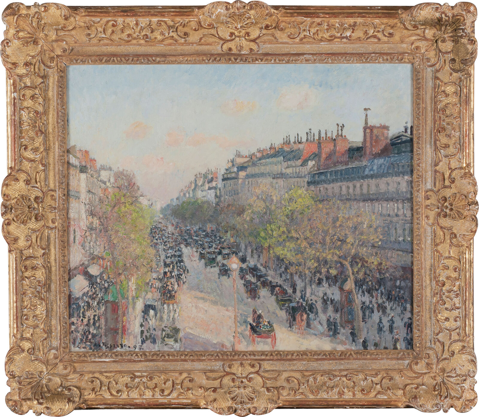 In a series of fourteen paintings Camille Pissarro focused on the Boulevard Montmartre in the center of Paris. From his room in the Grand Hôtel de Russie, with the opera building behind him, he had a view of the busy street on which twenty thousand carriages rattled by every day, past the expensive shops and the popular Café Tortoni. This picture shows the boulevard with fresh green trees in springtime.