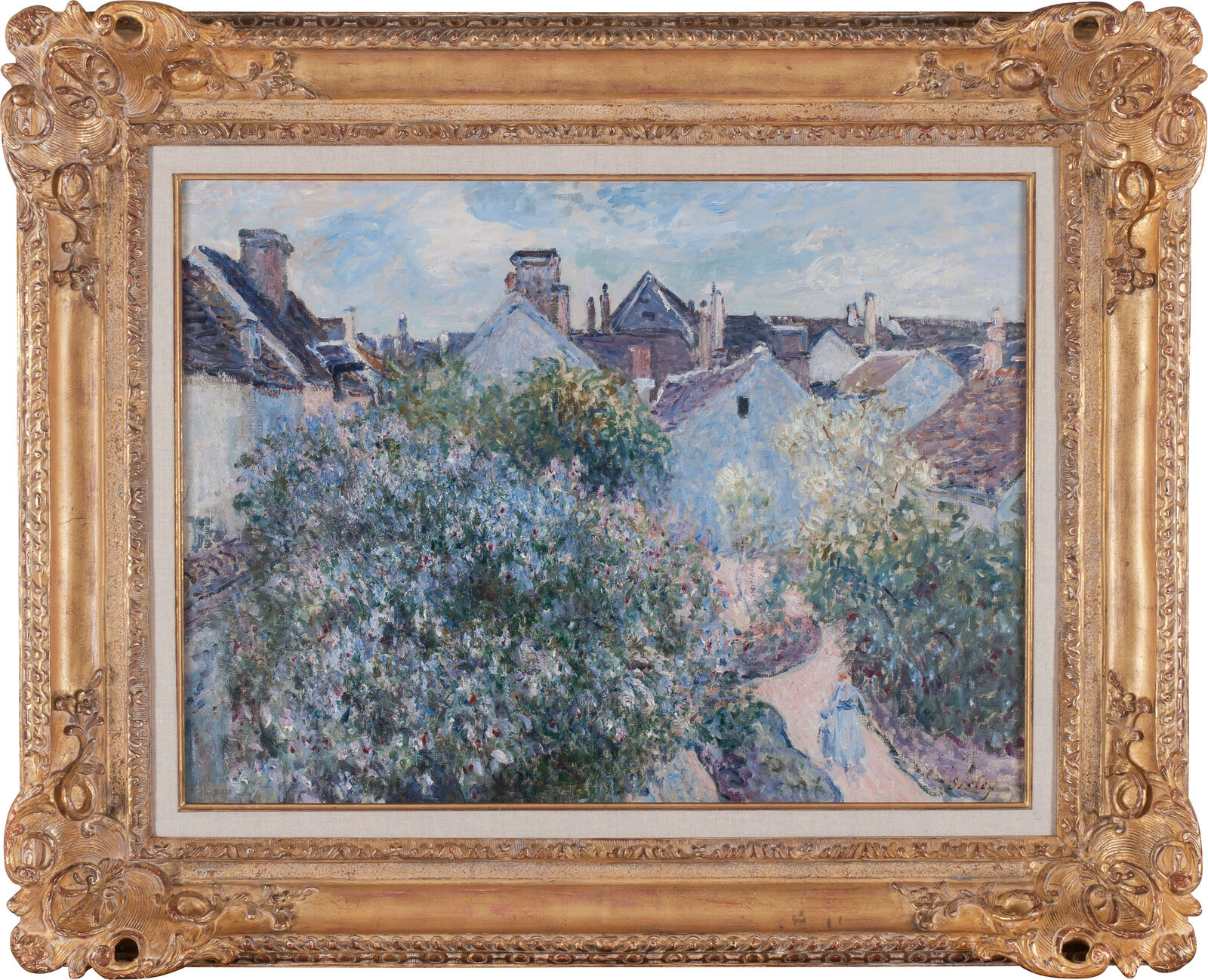 Alfred Sisley painted the blooming lilacs in his garden from the window of his studio. The cropping seems random, as is often the case in photography. The blue-violet color that attracted him here is also seen in the façades and the roofs of the surrounding houses. Even the woman and child on the garden path are included in this harmony of the color blue.